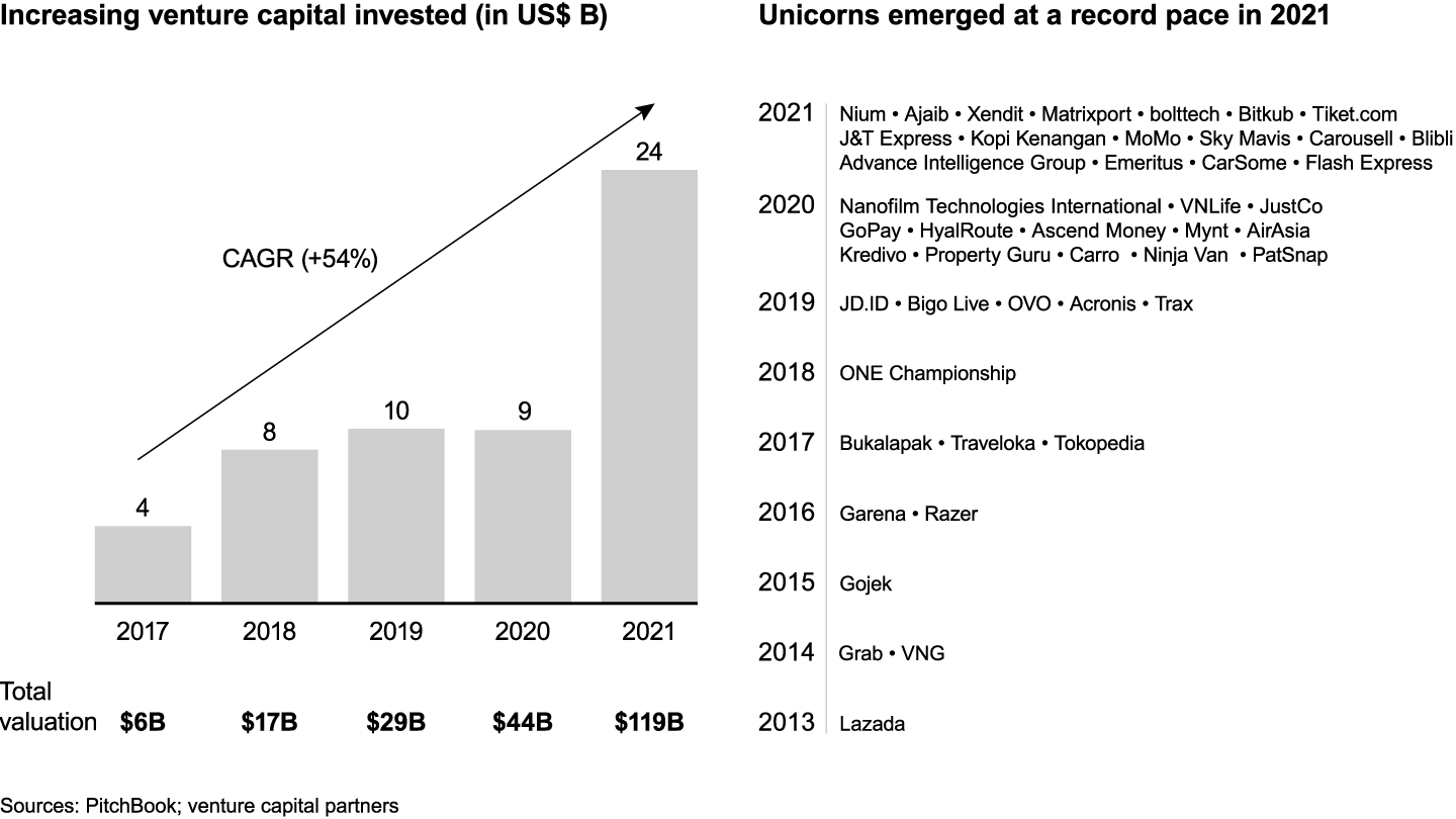 Venture capital is flooding in. The region is creating unicorns (privately held companies valued at $1 billion or more) at a record pace. In 2021 alone, the region minted 17 unicorns (see Figure 32).