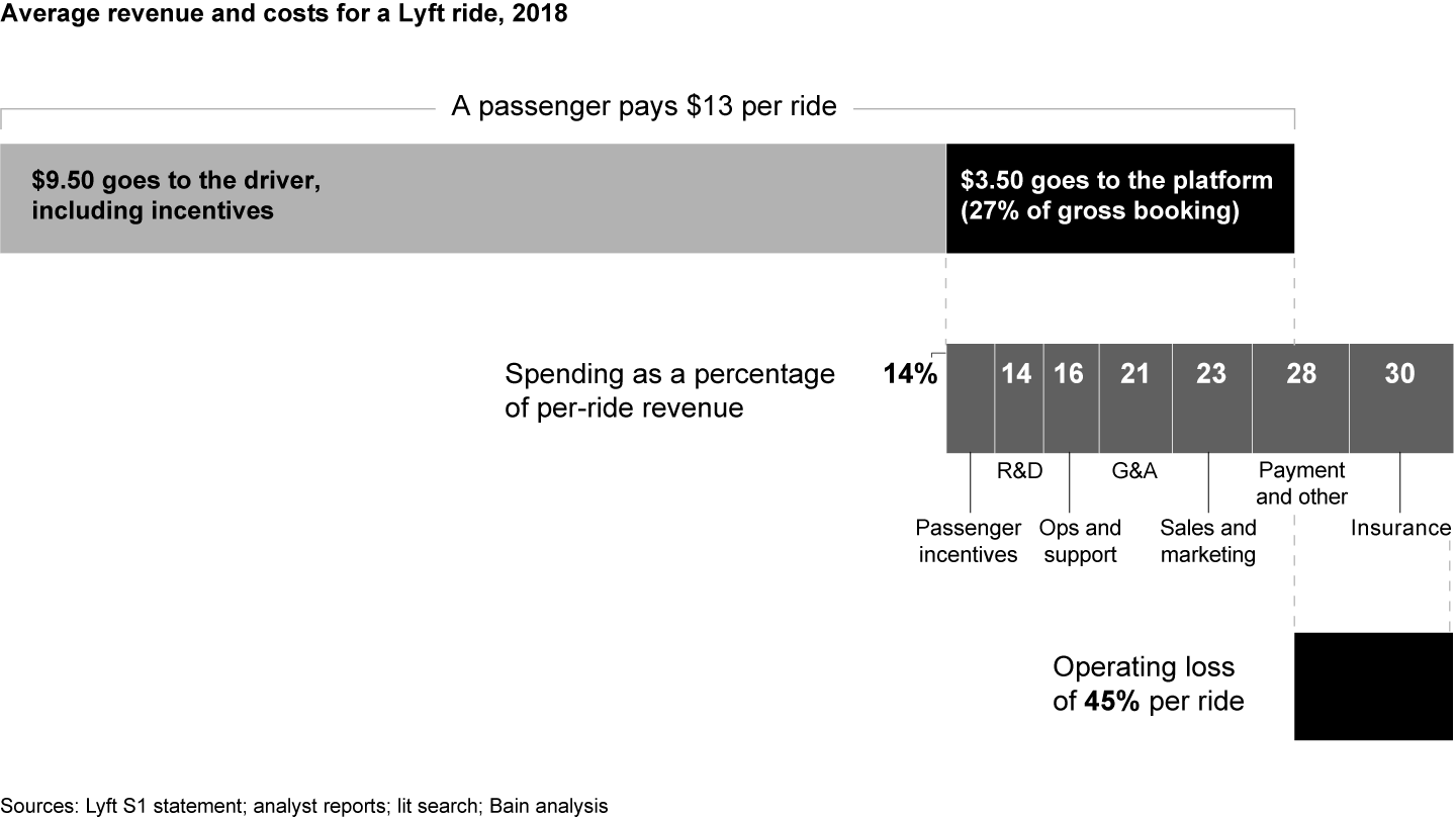 Create best-in-class operations. Companies are responding to the safety challenge through such features as emergency contacts, real-time location sharing, audio recordings and privacy numbers. These initiatives should help restore passenger confidence. However, companies need to aggressively improve their fare levels and take rates in order to counter some of the big costs contributing to their losses: driver pay, incentives and insurance (see Figure 4).