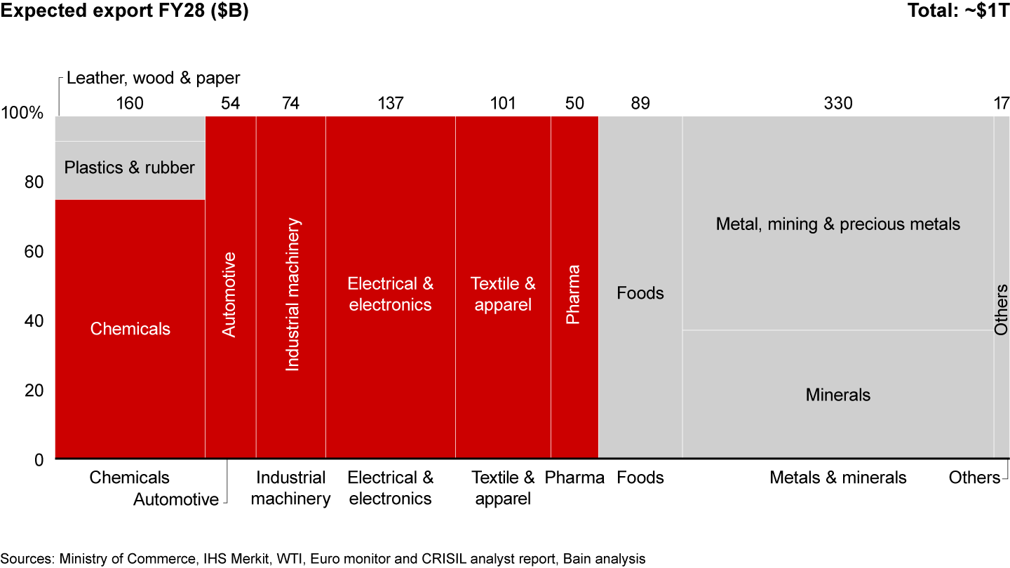 - Chemicals, pharmaceuticals, electronics, automotive, industrial machinery, and textiles (among others) are expected to propel manufacturing exports to reach $1 trillion by FY28.