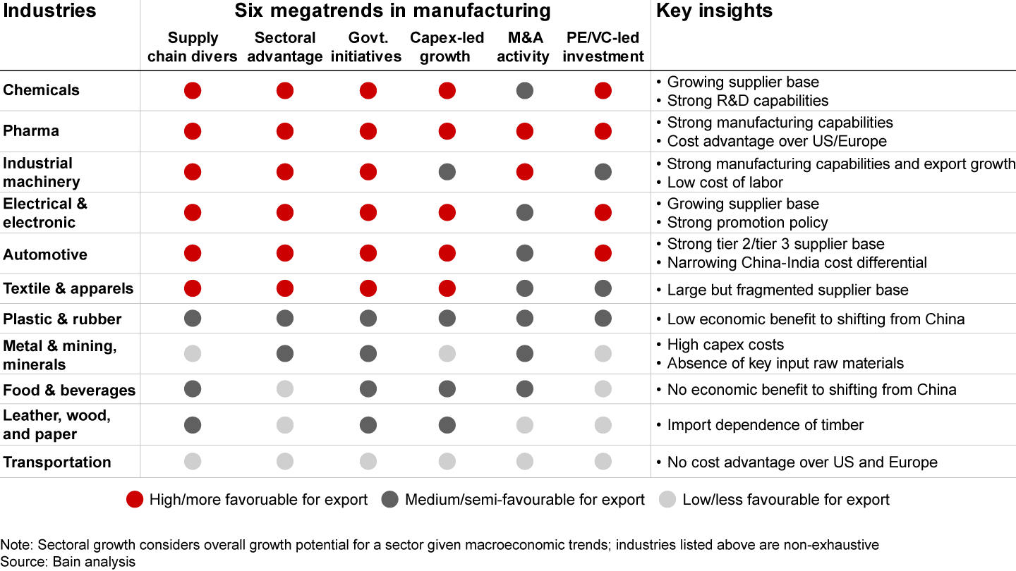 Propelled by favourable megatrends in manufacturing, India is expected to scale up its manufacturing exports to $1 trillion by FY28, and much of this growth will come from select sectors (see Figure 5). Bain analysis shows that the positive impact of the megatrends is already being witnessed in six key sectors (see Figure 6) and will accelerate further in the years ahead.
