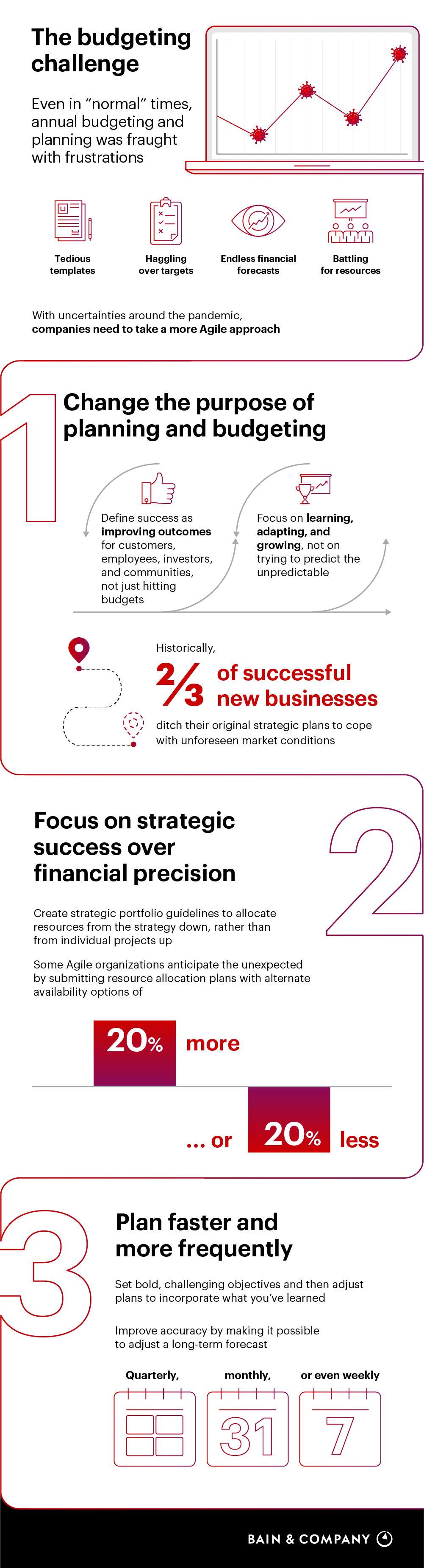 Infographic Three Steps to a Better Budget and Annual Plan Business operates in a climate of constant change. Here’s how you can make your planning and budgeting process more Agile. Di Darrell Rigby, Joost Spits, e Steve Berez Infographic Three Steps to a Better Budget and Annual Plan en Related An Agile Approach to Budgeting for Uncertain Times The pandemic is making the annual process even more challenging. But a more Agile approach can help. Autori Darrell Rigby Partner, Boston Joost Spits Partner, Boston Steve Berez Advisory Partner, Boston Contattaci First published in agosto 2021 Tags Agile Agile Enterprise Business Process Redesign CFO Insights