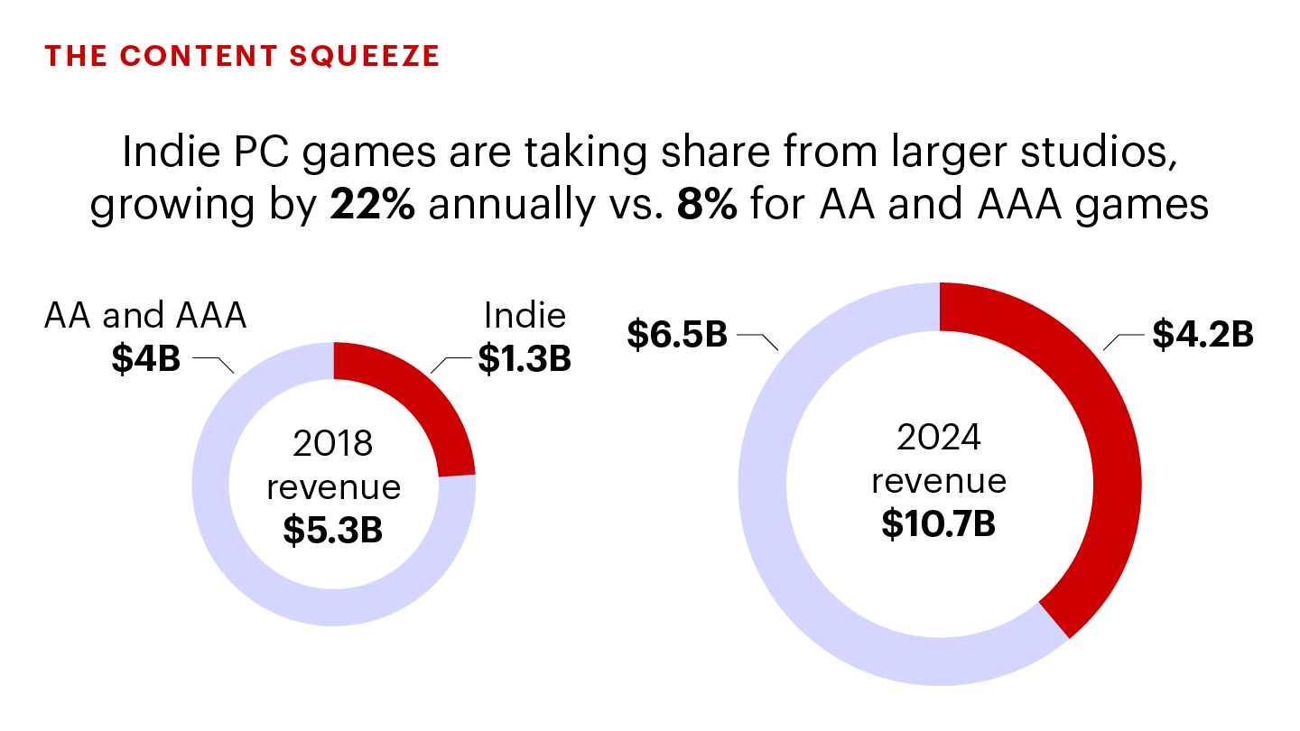 AAA studios are adapting, but they’re also getting squeezed by nimble indies capitalizing on evolving tastes and technology’s democratization of game development and distribution. Studios of all sizes are selling more directly to consumers, reducing distribution fees and deepening relationships with players. Stoking players’ love is even more crucial as fans spend more time with favorite franchises through cross-media extensions.
