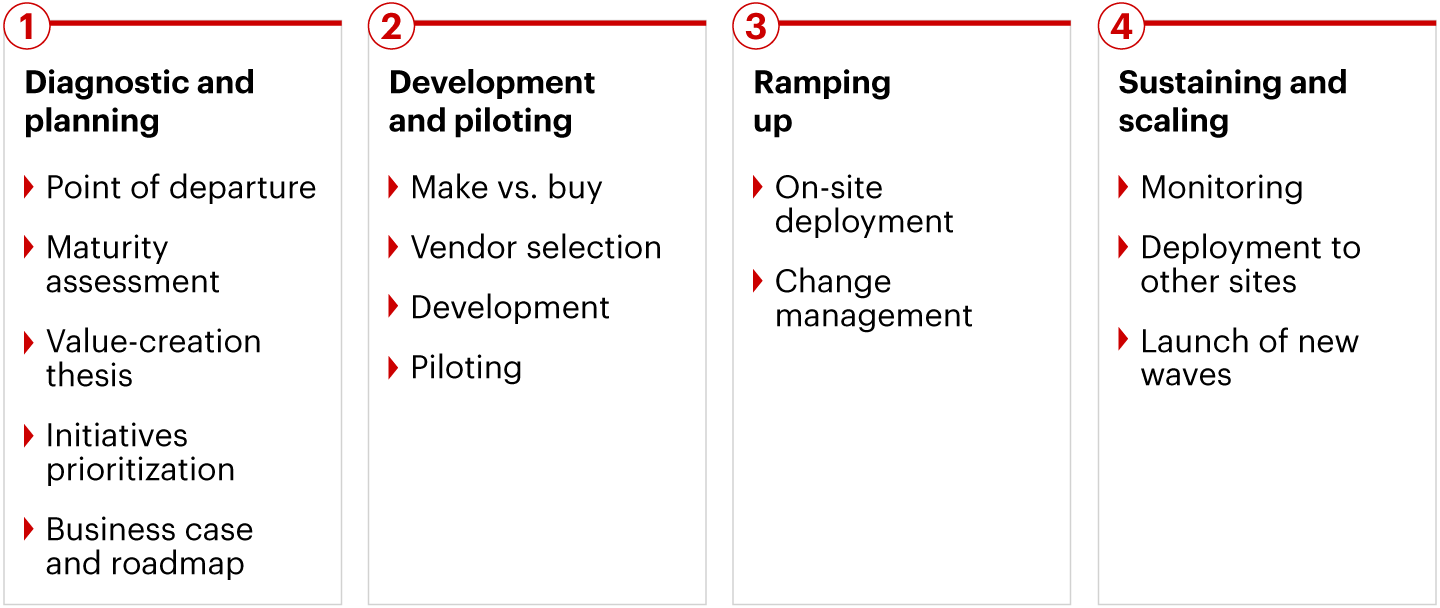 The journey to set up and deploy sensors and AI as part of a maintenance program typically consists of four phases (see Figure 2).