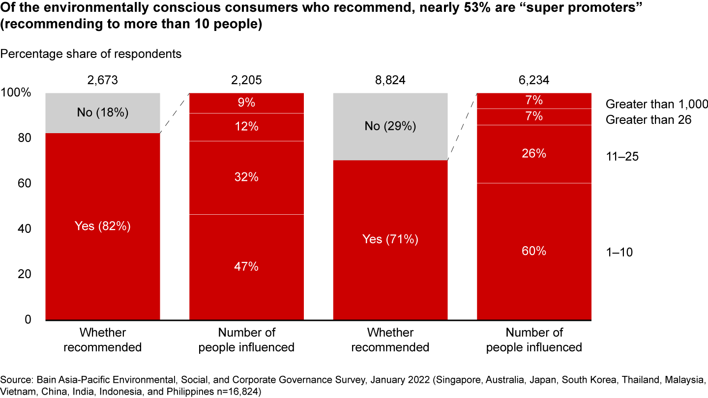 • Companies that close the say-do gap set themselves up for success. Four out of five environmentally and socially conscious consumers in Asia-Pacific actively recommend sustainable products that they like, and more than half of these consumers are “super promoters,” meaning they recommend the product to more than 10 people.