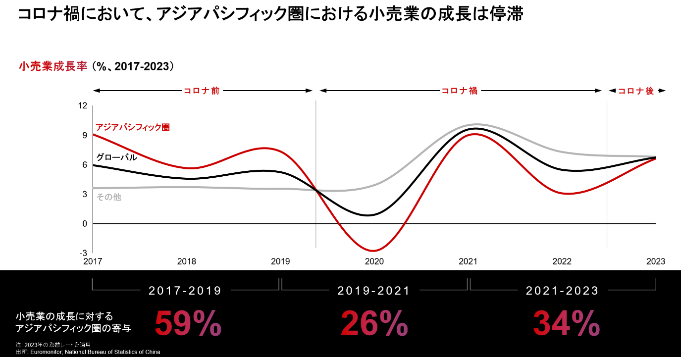 セミナーの冒頭、堀之内は2017年から2023年のアジアパシフィック圏における小売業の成長率を示しました。コロナ前にあたる2017年から2019年は低減しており、コロナ禍を経て停滞、現在は復調期にあり、グローバルに比べて大きかったへこみを取り戻しつつあると説明しました。
