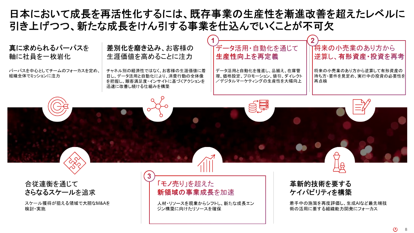 今後、日本が人口減少社会へ突入するにあたって、小売業を越えた収益源を開拓することは非常に重要です。堀之内は「既存の事業を今のまま拡大するだけでは必ず低減していく」と警鐘を鳴らし、販売カテゴリを増やす、地域を拡大する、新たなビジネスモデルの確立など、コア事業を越えた事業の拡大と利益成長が求められると強調しました。