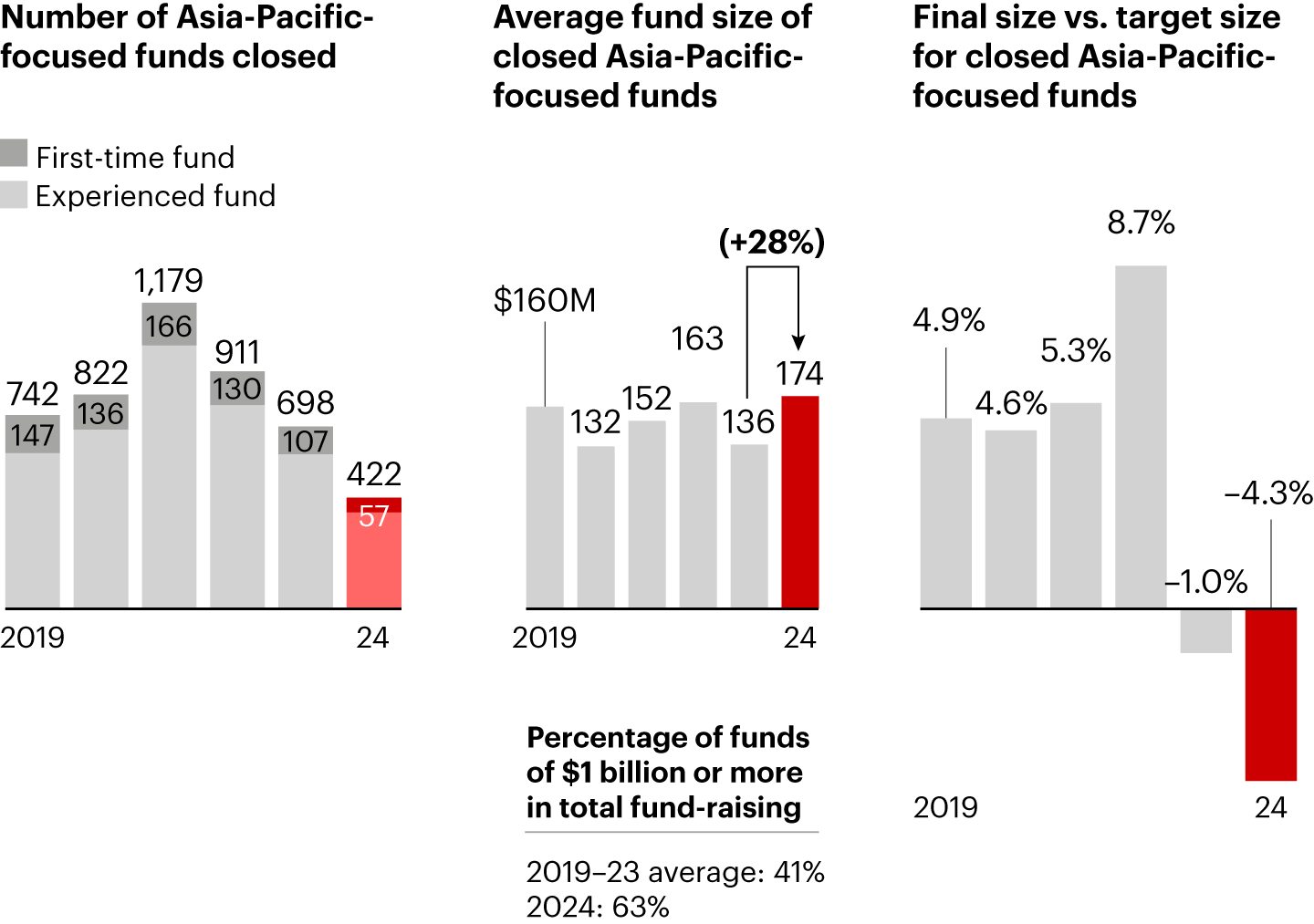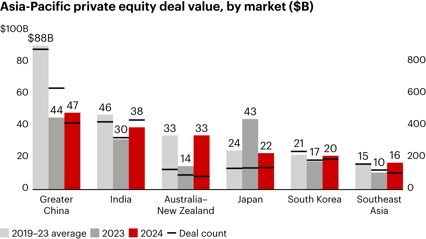 - Asia-Pacific deal value increased 11% in 2024, and exit value rose in every country except China, but fund-raising declined sharply.