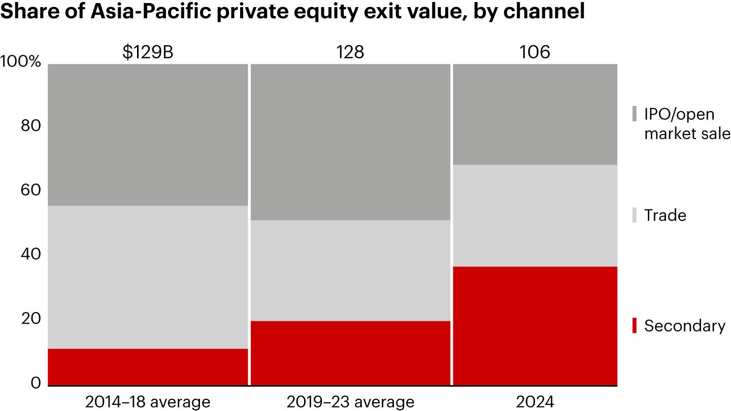 The number and value of exits in the Asia-Pacific market were flat, but a sharp drop in Greater China’s exit value masked gains in other countries. Most fund managers across the region said the exit environment improved in 2024. Secondary sales became the largest exit type, as well as an attractive channel for GPs to accelerate distributions and for LPs to improve liquidity. India became the region’s biggest exit market, powered by a large number of initial public offering (IPO) exits. The value of Asia-Pacific IPO exits fell to only 31% of total exit value in 2024, compared with the previous five-year average of 48%. The main reason for that decline was the sluggish public market performance in China and other markets.