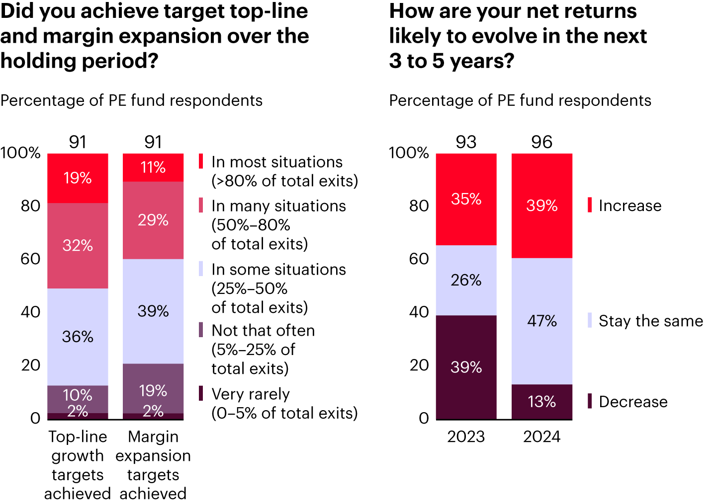 Many are also deploying generative AI, despite its complexity, as an additional force to propel the top line in a wide array of industries. Yet challenges persist. Nearly 50% of GPs we surveyed said they fail to meet the growth expectations for their portfolio companies in more than half the deals they close. Often, the problem is a lack of alignment between the PE fund and management on priorities and execution.