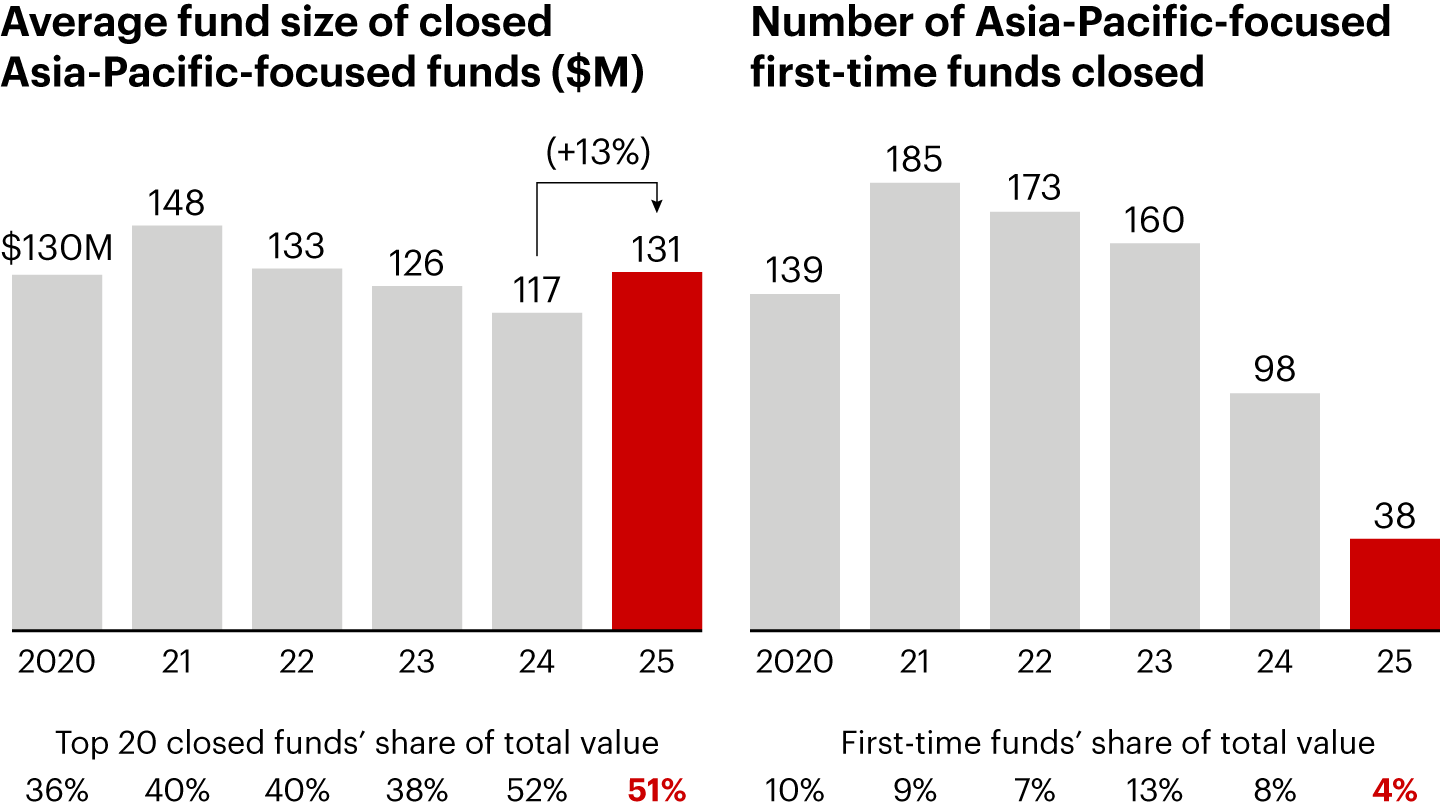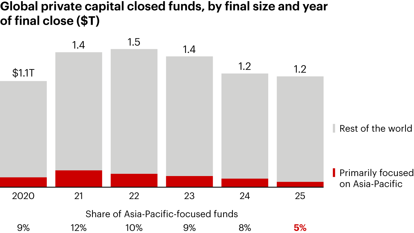 出所 PreqinDespite a challenging fund-raising environment, a large number of Asia-Pacific funds are on the road raising capital. Approximately 60 Asia-Pacific-focused funds with target sizes greater than $1 billion remain in the market. Together, these funds represent more than 10% of global fund-raising targets—well above the region’s 5% share of recently closed funds. This gap suggests a possible rebound in 2026 while also highlighting intensified competition for capital as LPs remain selective in allocating to the region. Early commitments to several large funds, however, provide an encouraging signal that fund-raising will begin to recover in 2026.