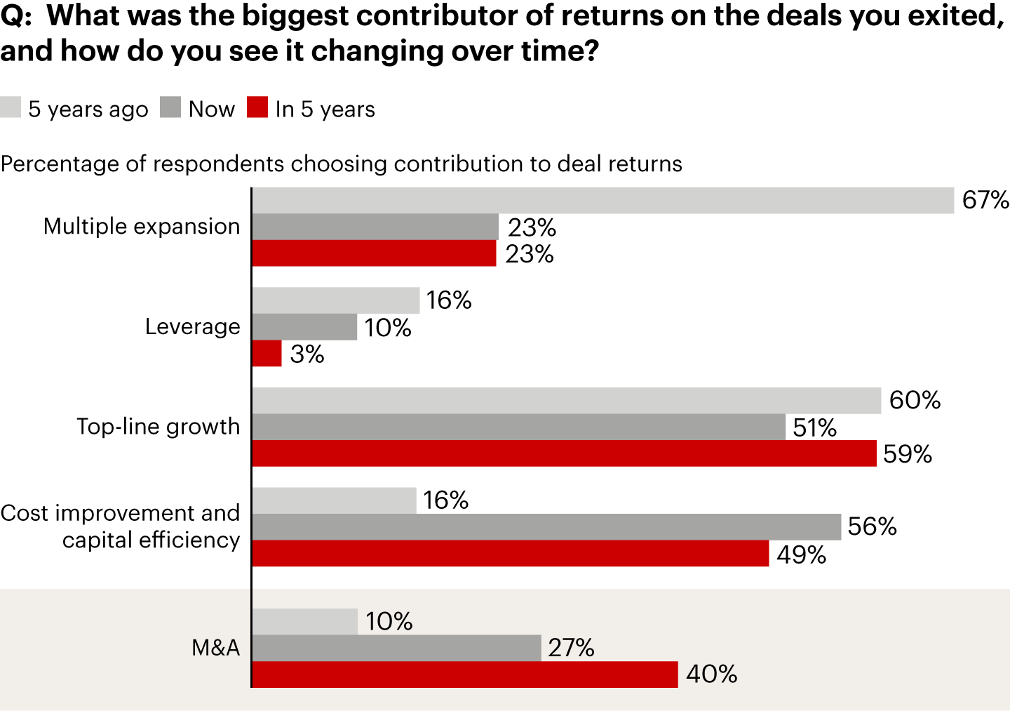 出所 PreqinOperational improvements remain the primary source of returns. As in 2023 and 2024, cost reduction (cited by 56% of respondents) and revenue growth (51%) were the most important contributors to deal-level performance and are expected to remain so. Over the next five years, GPs anticipate a greater role for mergers and acquisitions in generating returns, with 40% citing it as a key contributor, compared with 27% today and 10% five years ago. This shift reflects a move away from reliance on financial tools—such as leverage and multiple expansion—toward operational execution and strategic scaling as organic growth becomes harder to sustain amid macroeconomic uncertainty (see Figure 18).