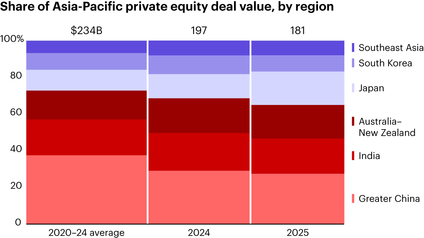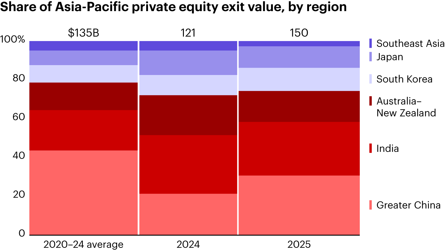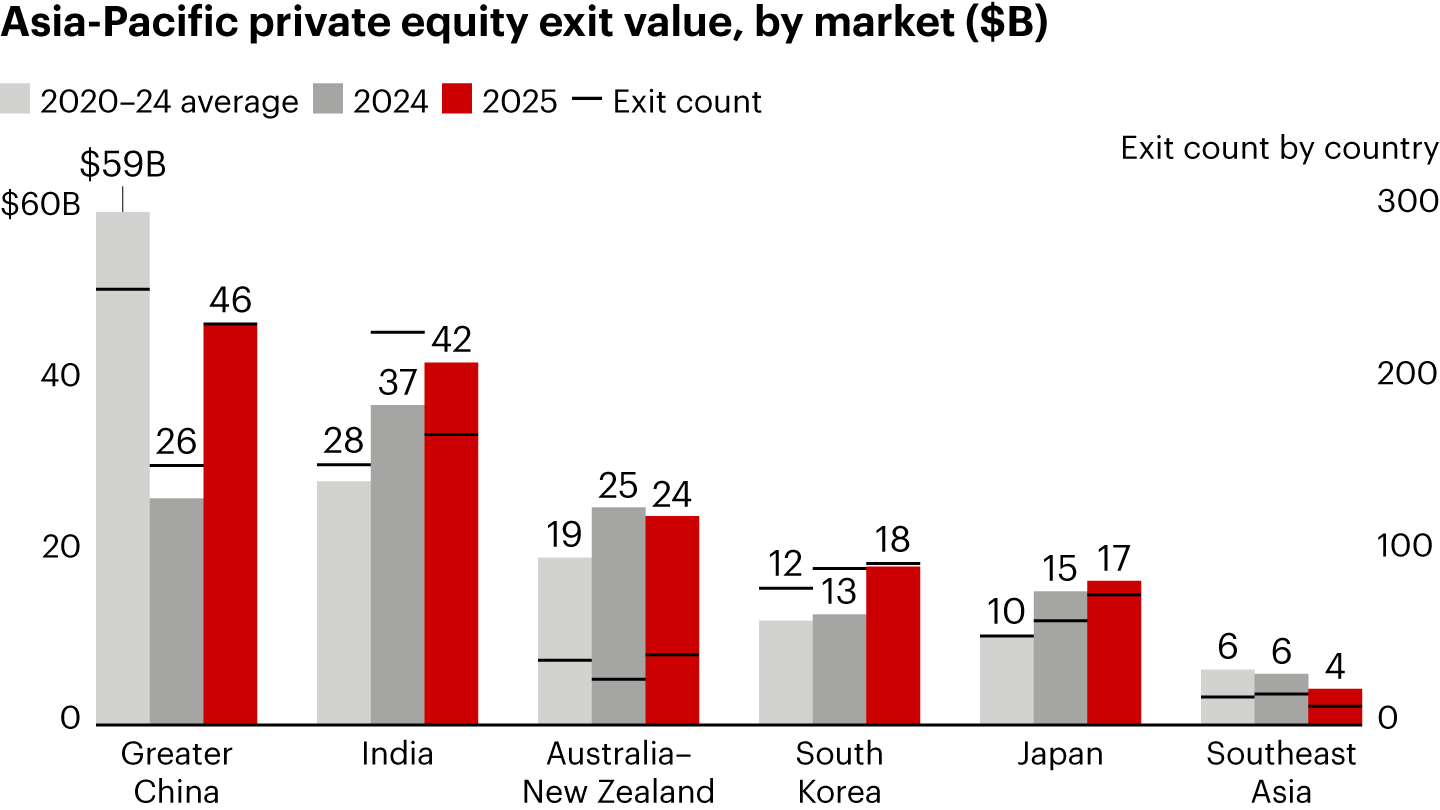 Sources: AVCJ; Bain analysisIn 2025, Greater China overtook India to reclaim its position as the region’s largest exit market (see Figure 9). Greater China and South Korea led the growth in exit value, with high double-digit year-on-year increases. Greater China was the region’s bright spot this year as exit volume and value surged, and investor sentiment improved. India's exit value grew as investors capitalized on richly valued public markets and pursued a select number of large deals. South Korea benefited from a depreciating local currency, which helps make some assets’ pricing attractive for trade and secondary sales to global investors. Japan and Australia–New Zealand produced more exits, but the exit value for Australia–New Zealand was flat. Southeast Asia's exit count remained muted amid tariff uncertainty, which dampened demand for export-oriented manufacturing assets.