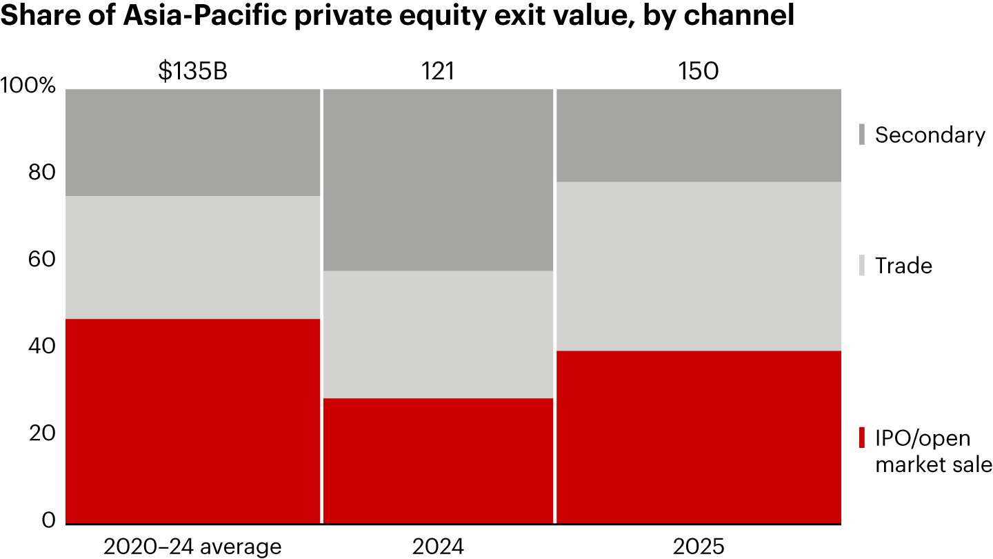Trade exits remained strong in 2025, growing more than 60% year over year and ranking as the second-largest exit channel. Large-scale trade transactions occurred across most markets, including Temasek’s $6.4 billion sale of Schneider Electric India, Bain Capital’s $4.0 billion sale of WinTriX DC Group in Greater China, Macquarie’s $3.3 billion sale of DIG Airgas in South Korea, KKR’s $2.6 billion sale of Seiyu in Japan, and Brookfield’s $2.5 billion sale of Aveo in Australia–New Zealand.