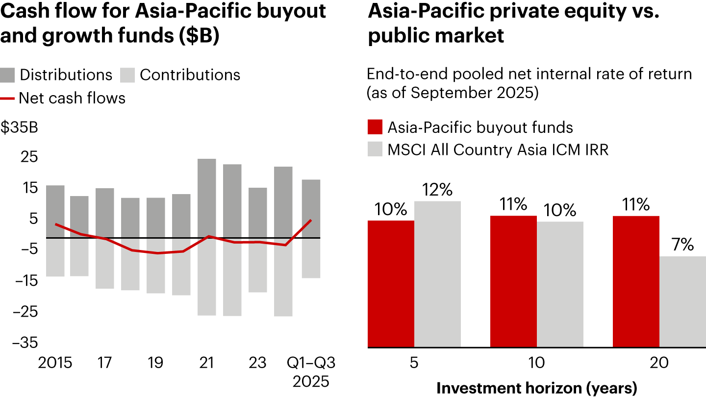 出所 MSCI (as of September 30, 2025)Private equity’s long-term performance advantage remains intact. Based on the MSCI proprietary market index, Asia-Pacific buyout funds continued to outperform public markets over 10- and 20-year horizons as of the third quarter of 2025. Over shorter periods, however, strong public market performance has narrowed the gap, weighing modestly on five-year private equity returns.