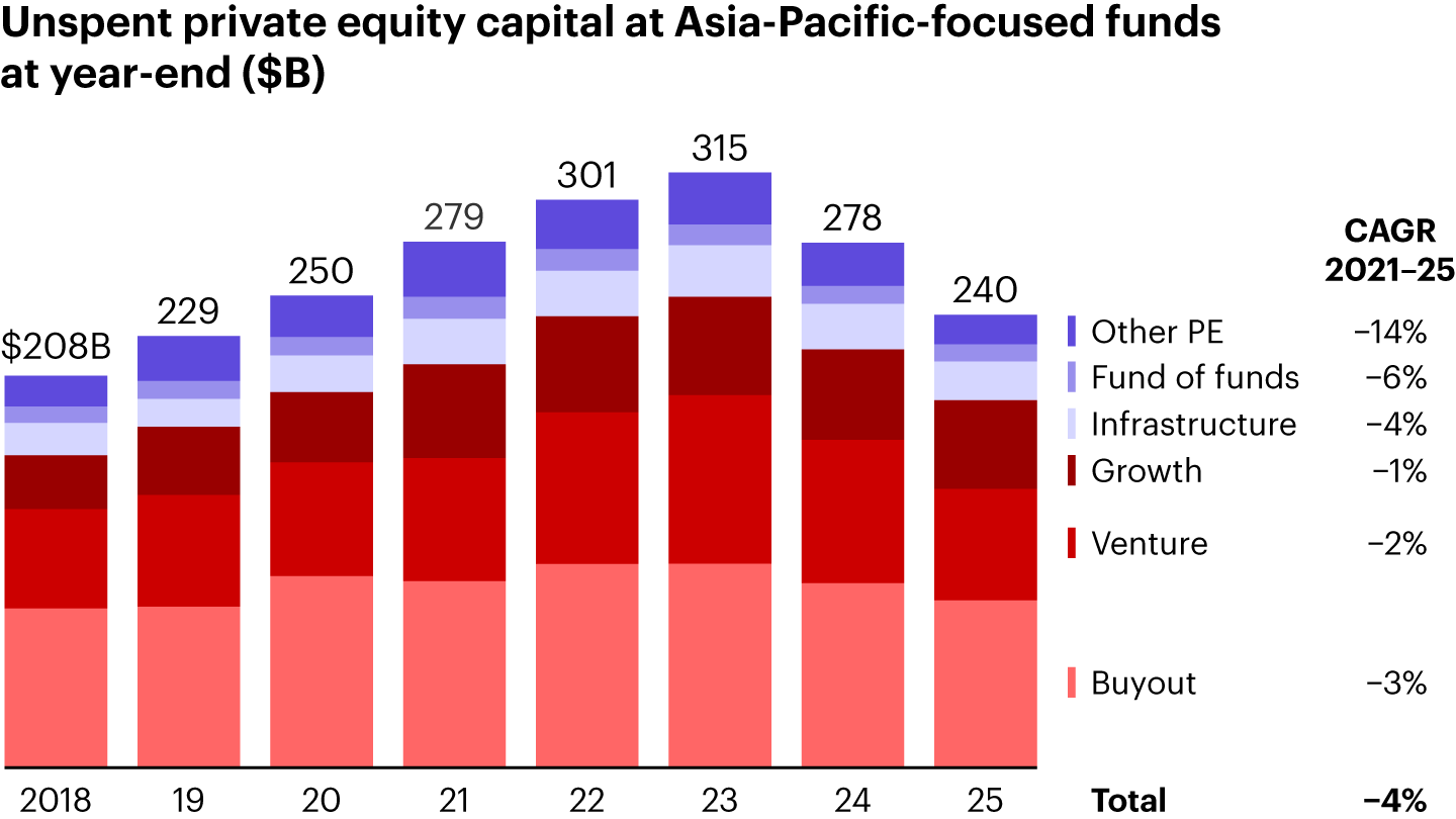 Sources: Preqin; Bain analysisAcross the broader region, weaker fund-raising and slower deal activity continued to reduce dry powder (see Figure 15). Uninvested capital in Asia-Pacific declined from its 2023 peak of $315 billion, extending the downward trend that began in 2024, and fell to $240 billion by the end of 2025.