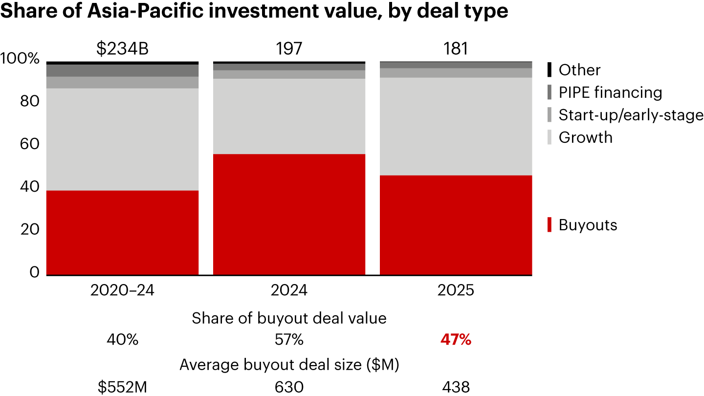 Buyouts maintained a roughly 50% share of total value, but average buyout transaction size declined, driven by a lack of blockbuster deals. Australia–New Zealand, Japan, and South Korea remain traditional buyout-dominant markets, each with a buyout share of more than 60%.