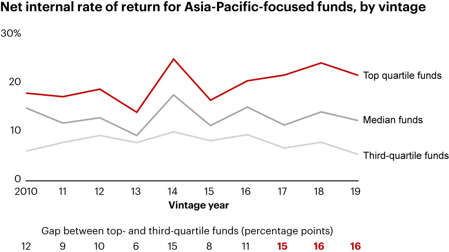Asia-Pacific fund managers grew more optimistic by the end of 2025. Eighty-eight percent of respondents expect returns to hold steady or improve over the next three to five years, up from 61% in 2023. However, the gap between top- and lower-performing managers continues to widen (see Figure 17). Top-quartile funds from the 2017–2019 vintages delivered internal rates of return of 22% to 24%, extending their lead over third-quartile peers. This divergence is reshaping fund-raising as LPs increasingly concentrate capital with proven, high-performing managers. For GPs, the ability to consistently create value, compound performance, and ultimately convert gains into realized returns has become the defining factor for sustained success.