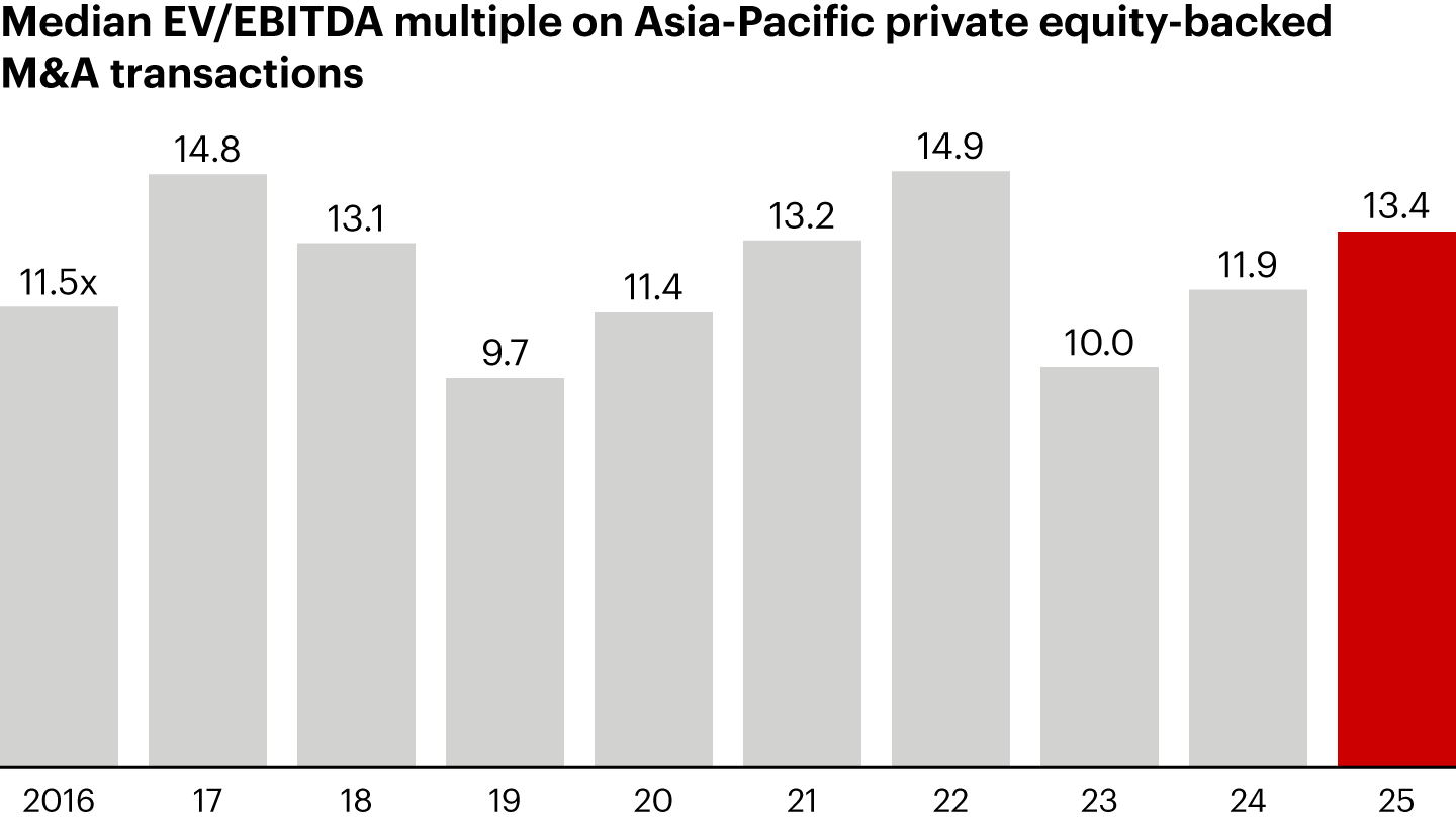 Deal multiples rebounded in 2025, with the median deal multiple rising to 13.4 times from 11.9 times in 2024 (see Figure 7). Several factors contributed to the increase, including a rally in public equity markets in several Asia-Pacific markets, which in turn raised comparable valuations and seller expectations. For example, the Hang Seng Index’s trailing 12-month P/E ratio rose 31% to 11.77 times at year-end, from 8.96 times on the first trading day of 2025. At the same time, capital deployment has gravitated toward assets with strong fundamentals, more predictable earnings profiles, and clearer exit visibility. All those factors help justify valuations and control risk amid market uncertainties.