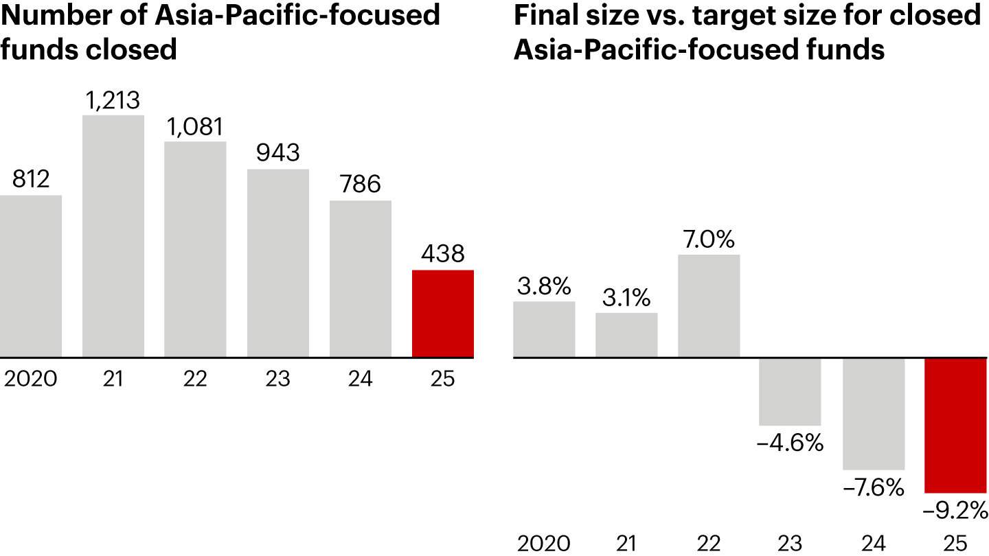 Sources: Preqin; Bain analysisRaising capital to target fund sizes has become increasingly difficult, with conditions deteriorating further in 2025. On average, Asia-Pacific funds closed the year at 9% below their stated goals—the widest gap between announced fund sizes and final closes observed in the past decade.