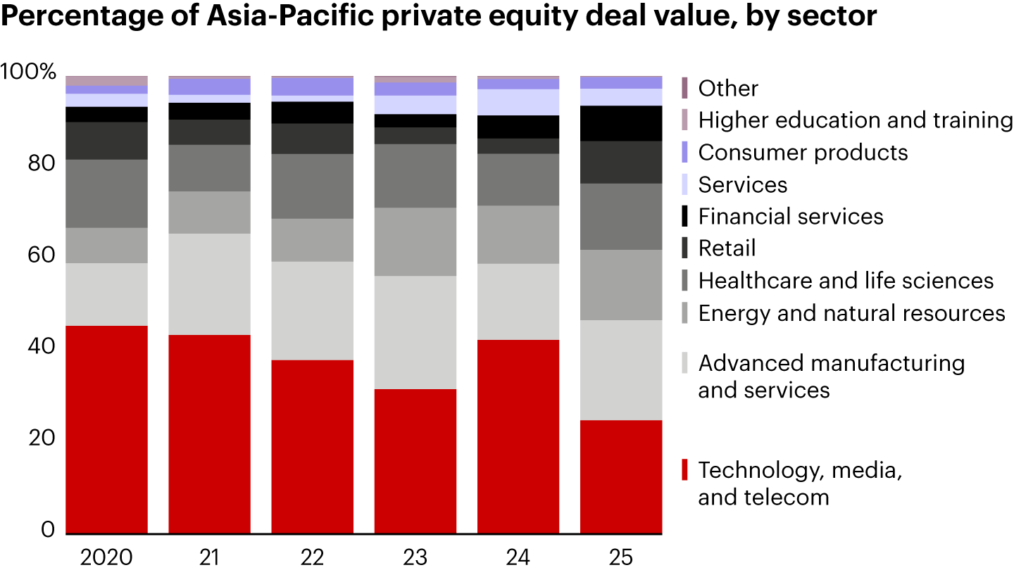 Sources: AVCJ; Bain analysisPrivate equity investments are growing more balanced across industry sectors (see Figure 6). Technology, media, and telecoms is still the largest Asia-Pacific sector; however, its share dropped to only 25%, a ten-year low, down from a five-year average of 41%. Advanced manufacturing and services was the second largest (22%), followed by energy and natural resources (15%) and healthcare and life sciences (14%).