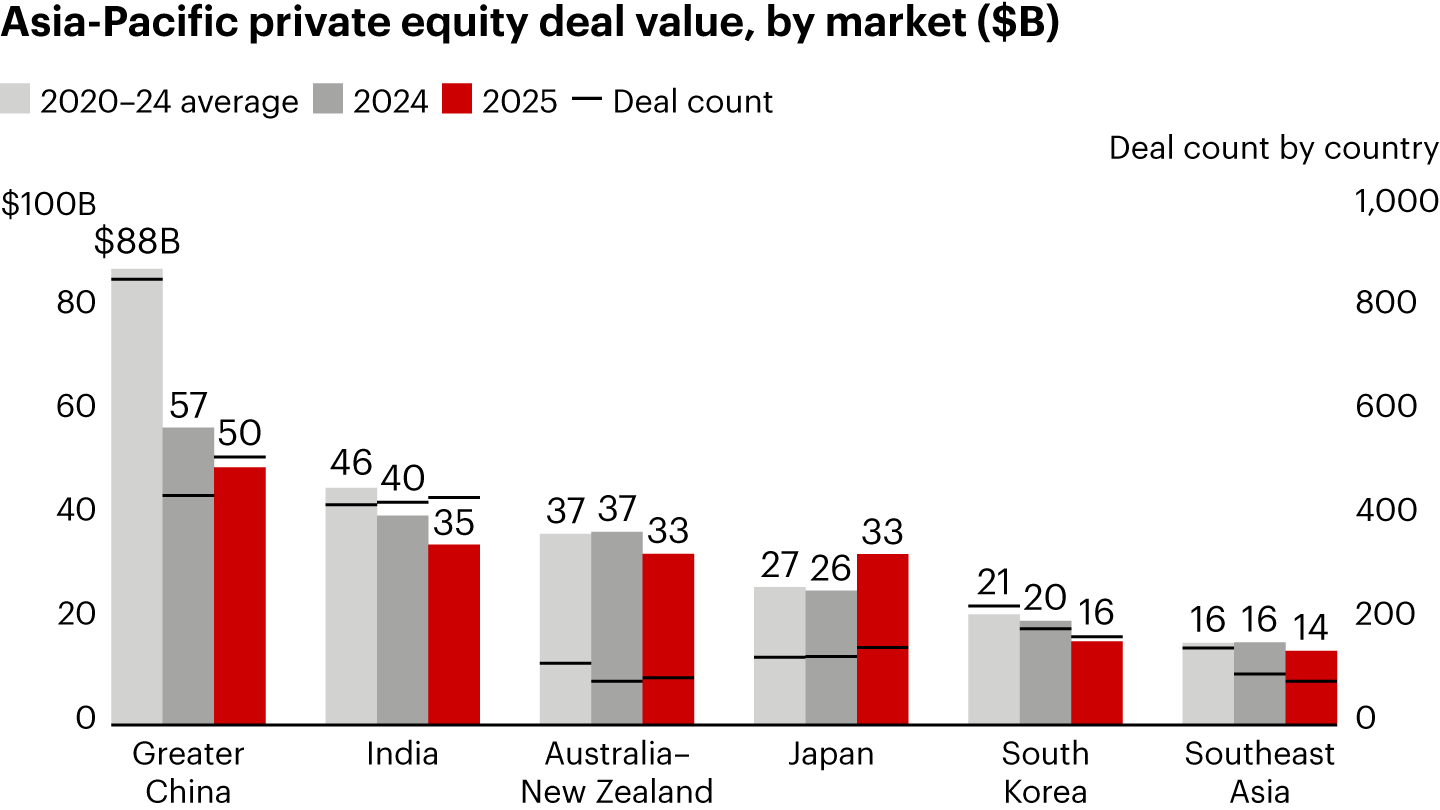 Sources: AVCJ; Preqin; Bain analysisDeal performance diverged by market. Japan again stood out, generating growth in both deal value and count. Corporate governance reforms, ample carve-out and privatization opportunities, and supportive financing conditions helped enable dealmaking. Greater China recorded double-digit growth in deal count from a relatively low base, supported by improved policy visibility and market sentiment.
