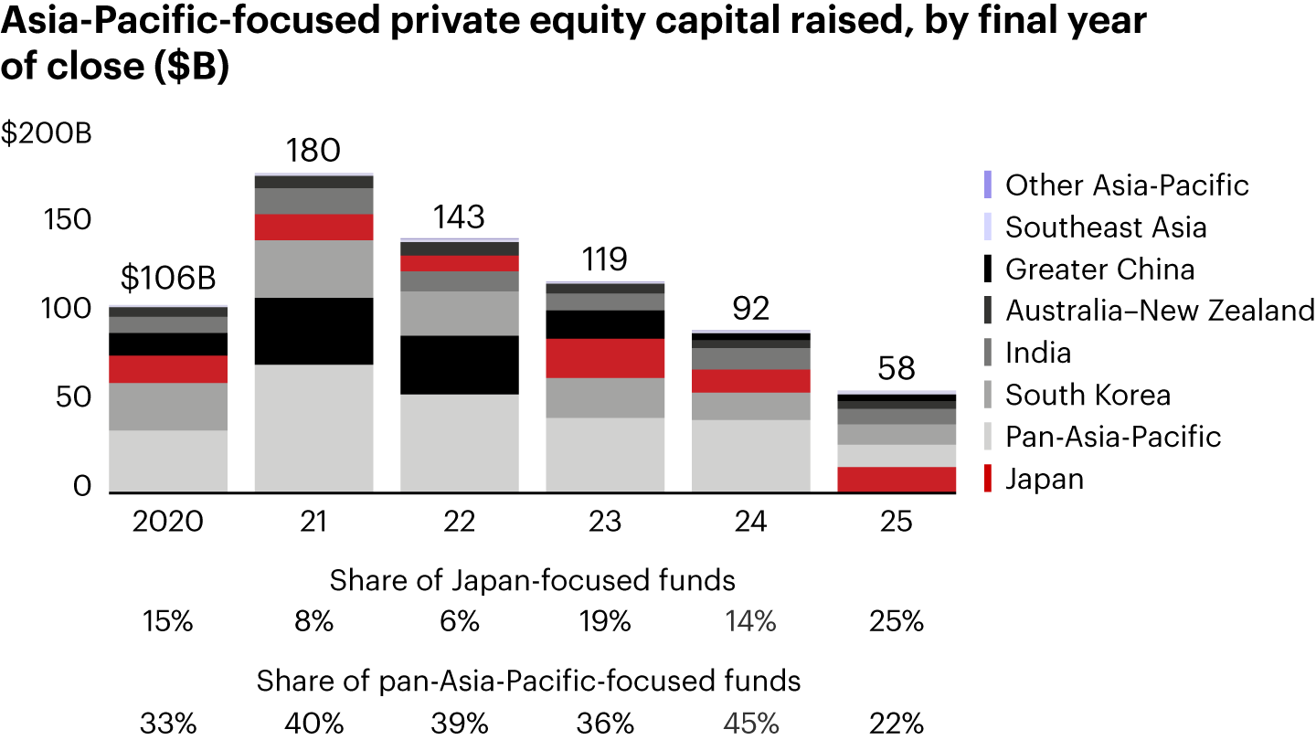 Japan stood out as the region’s bright spot in 2025. It led in deal activity and captured the largest share of fund-raising (see Figure 14). Japan-focused funds raised $15 billion, up 12% year over year, making Japan the largest contributor to Asia-Pacific-focused fund-raising.