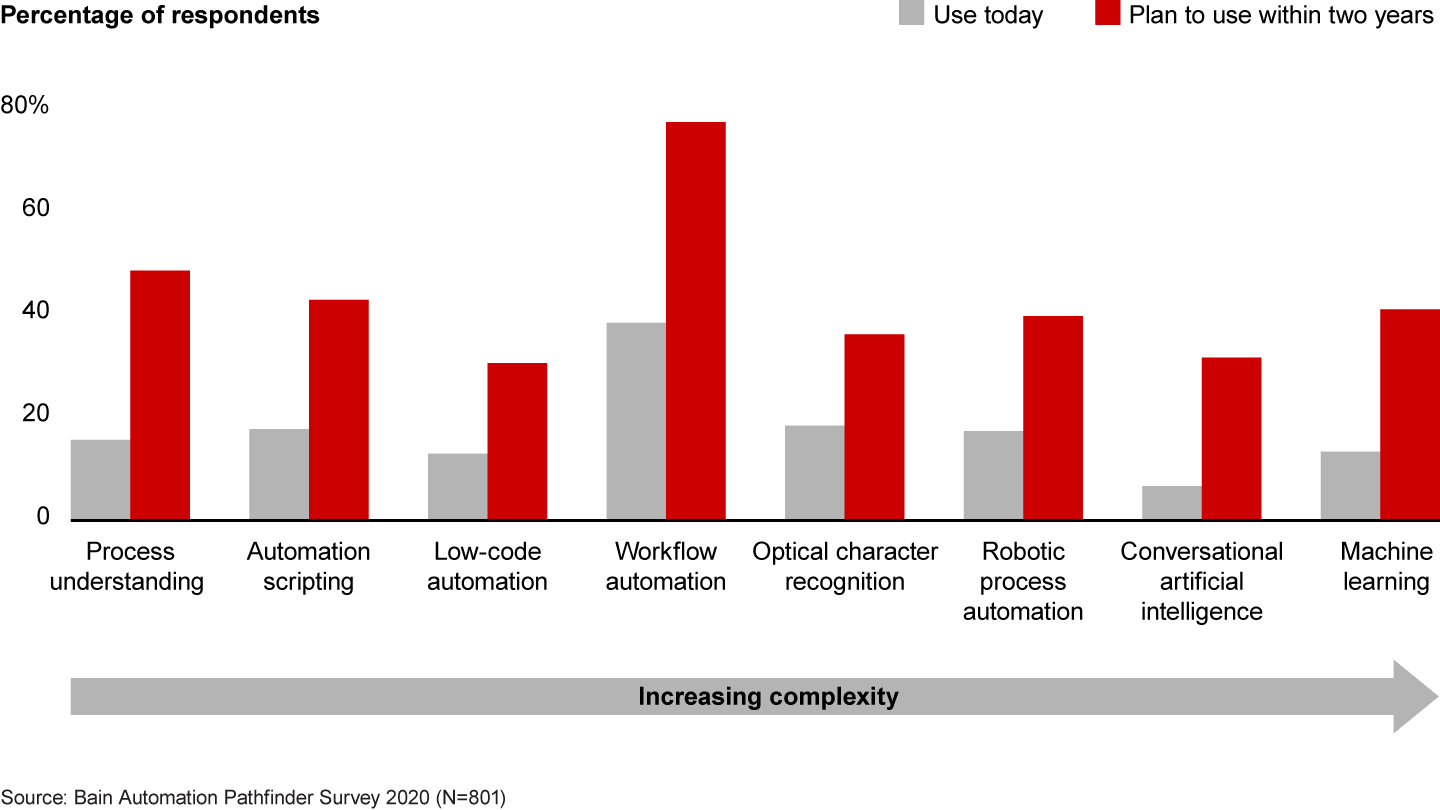 As companies try to get more out of automation, they are looking at an array of technologies (Figure 2). Automation software providers are responding by expanding their capabilities and developing platforms that combine multiple technologies, such as artificial intelligence (AI), robotic process automation (RPA), workflow automation, and optical character recognition.