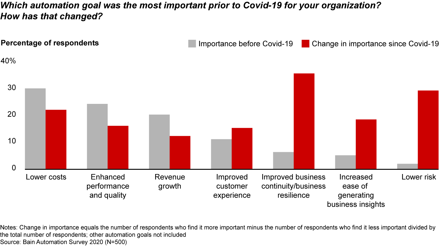 The pandemic is requiring many leaders to think more boldly about what automation can do for their businesses (see Figure 1). Lowering costs will remain a top reason to automate, but, in response to the pandemic, companies increasingly are deploying automation to strengthen business resilience, reduce risk, and generate useful business insights more easily.