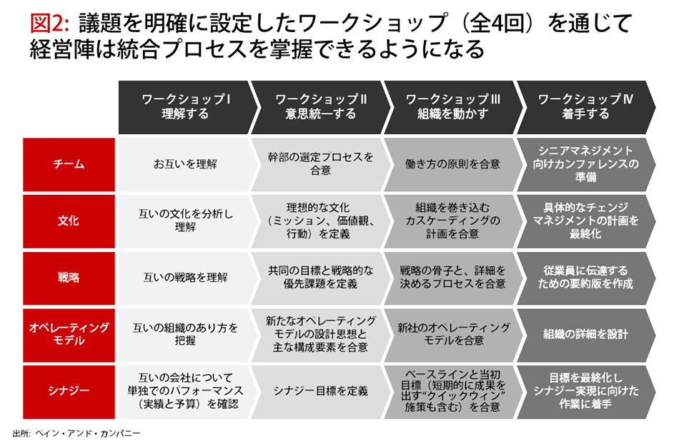 この産業材メーカーのCEOは、買収契約締結直後に新任の経営チームとのワークショップ(全4回、各回はそれぞれ2日以上)を3ヵ月間にわたって設定した(図2参照)。目的は「新会社の基本方針を共に作り上げる」ことであった。このワークショップのうち3回がクロージングの前に行われたことは、特筆すべきであろう。つまり、ワークショップ実施に当たっては、独占禁止法の順守が必要だった。例えば、両社は競合他社としてふるまう必要があり、共有できない情報もある程度存在した。ベインの経験では、たとえこのような制約があっても、クロージング前に進められることは多い。この期間は合併後の新会社の基本方針を築くために利用可能であり、これは統合案件のほぼ全てに当てはまる。