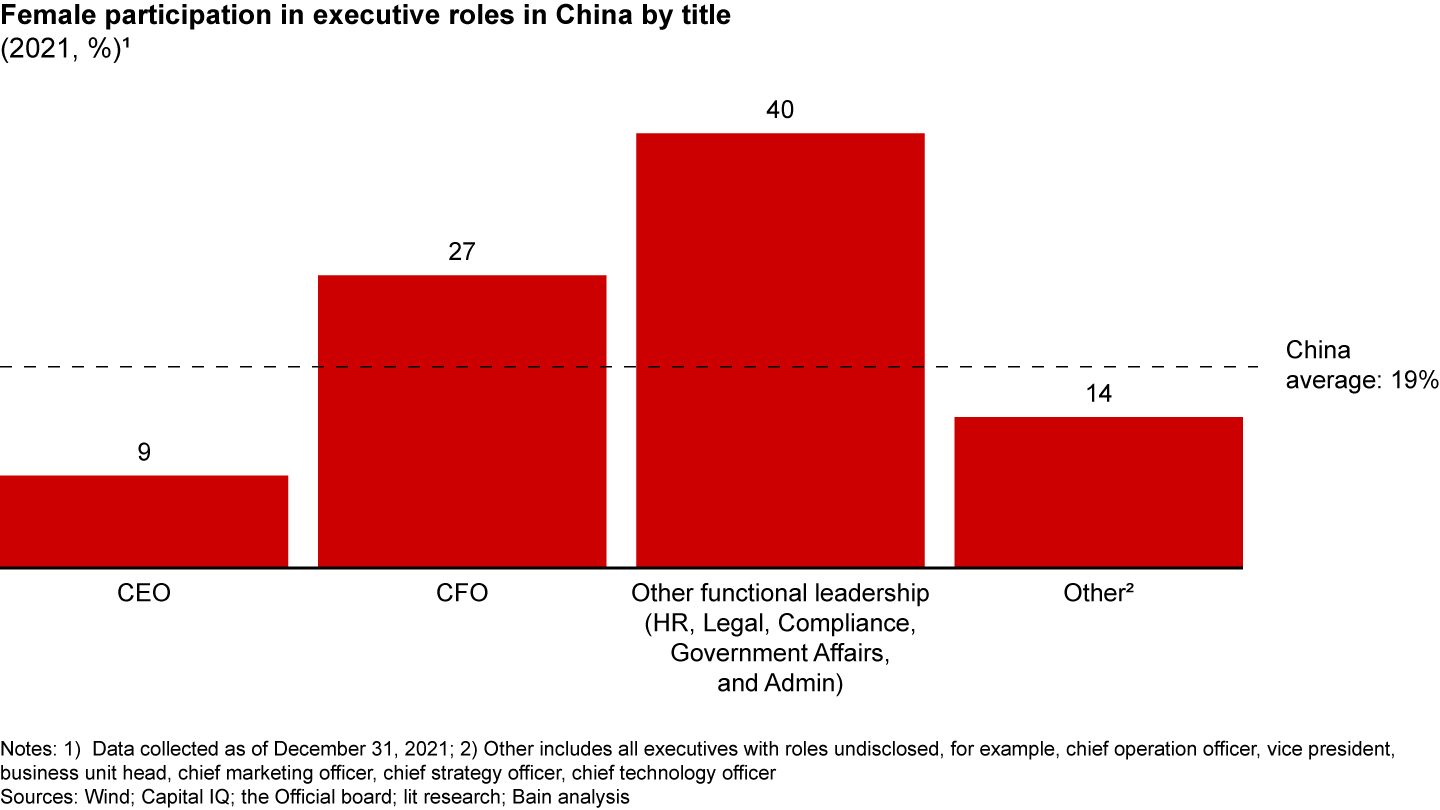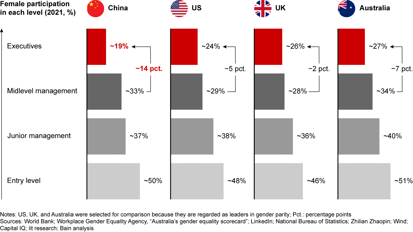 - Despite high workforce participation, fewer women advance to the executive level in China than in other countries.