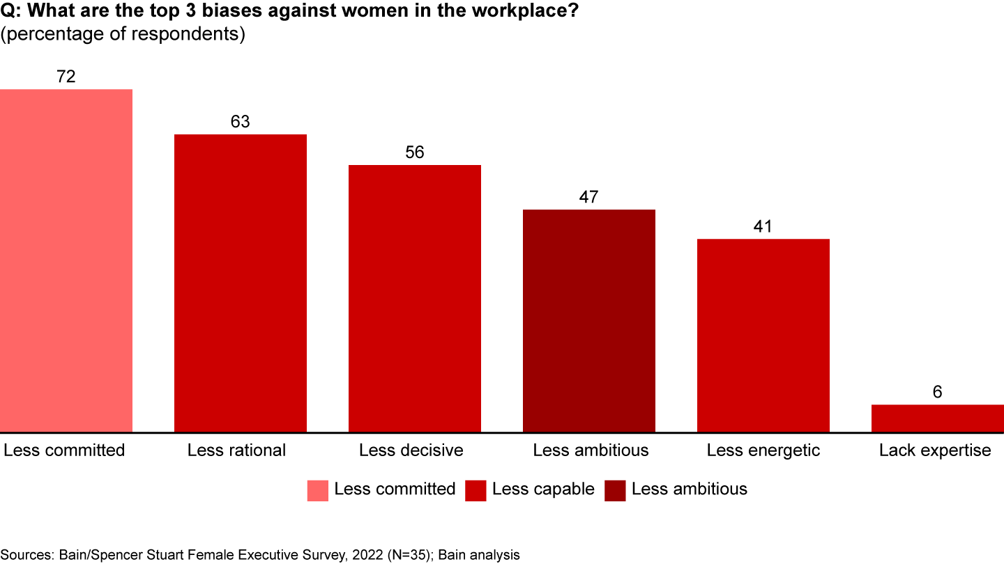According to our research, women in the workplace are perceived as less committed, less confident, and less ambitious (see Figure 9).