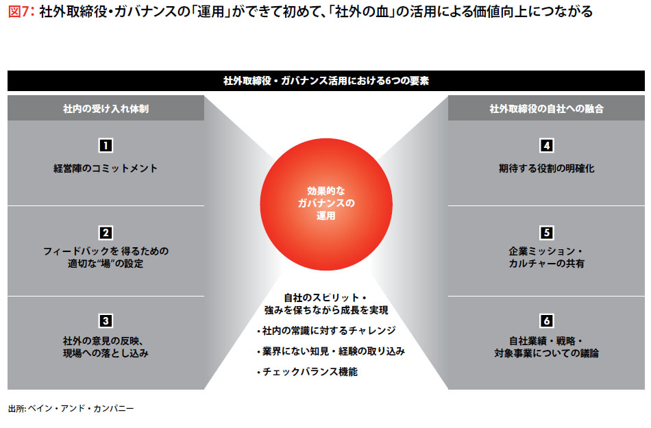 ガバナンスを効果的に運用している企業の経営陣に対するインタビューによれば、効果的な運用に不可欠なのは、社外取締役を適切に受け入れる体制の整備と、社外取締役を積極的に自社へ融合させるための仕組みである