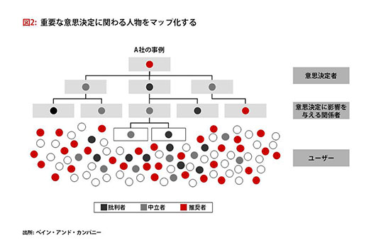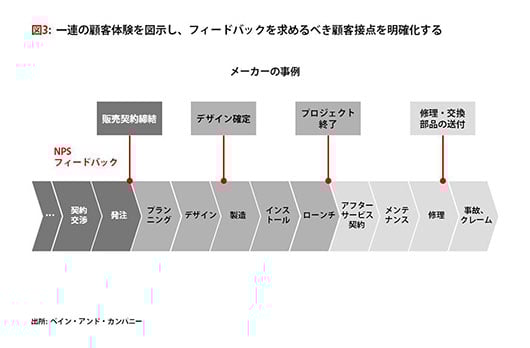 NPSの調査方法は、個々の業界に合わせてカスタマイズする必要がある。B2Bでは発注担当者からその上司、そして実際のユーザーに至るまで、複数の担当者が関わる場合が多い。各担当者はそれぞれ異なるニーズを有しており、異なる顧客接点が求められる。いつ、どのように、誰を巻き込んでいくべきかという設計は、各業界の流通構造(仲介業者はいるか)、顧客企業の意思決定プロセス(重大な影響を与える外部関係者はいるか)、重要な顧客接点や顧客にとっての「真実の瞬間」といった点によって左右されるだろう(図2、3)。