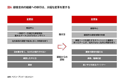至ってシンプルな提案である「顧客の立場に立って考える」ということは、非常に複雑であるB2B市場においても効力を発揮し、企業に持続的な競争優位性をもたらす。しかし、顧客志向になるということは、従業員の働き方や行動、考え方などを大きく変える必要があるということだ。特定の商品のみにこだわる姿勢から、顧客を含むより広い視点を持つことへ。部署単独の評価指標(KPI)から、組織全体で統一された信頼性の高い評価指標へ。自由度がなく固定化されたプロセスから、顧客をサポートすることに主眼を置いたチームごとの権限へ。より多くの企業がこのことに気付くことで、顧客ロイヤルティへのこだわりが企業の成長や収益性向上にもたらす影響度合いがさらに大きくなることだろう。