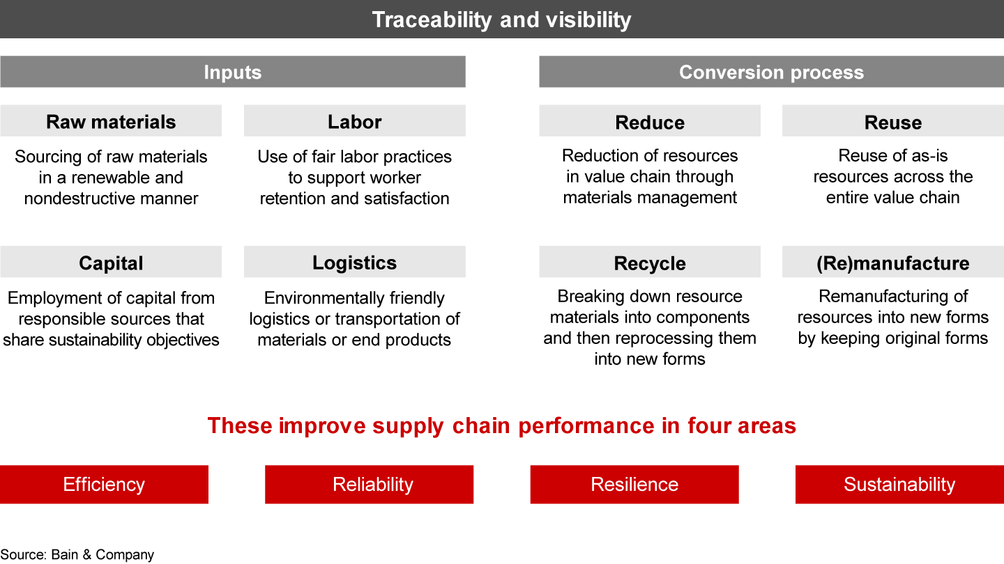 To achieve the visibility and traceability that resilient supply chains need, companies are adopting so-called “control towers.” Today’s control tower solutions range widely in technical sophistication. Some provide real-time data across the full supply chain and can predict sub-optimal events or disruptions, while less sophisticated ones focus on limited portions of the supply chain, with batched data, and less ability to predict. With the right data and deep transparency, control towers can not only boost resilience, they also make it easy to embed sustainability into the overall supply chain decision-making across both the inputs to the supply chain and the corresponding conversion processes (see Figure 1).