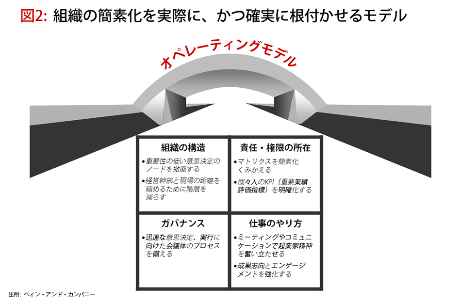 組織の簡素化とは、単に組織図を描きかえることではない。責任の所在を明らかにし、ガバナンスルールを定め、仕事の進め方の再定義を通じて、社内のプロセスそのものを簡素化することが求められる。そうしないと組織の簡素化は持続的な結果をもたらさず、やがて複雑性が舞い戻ってしまう(図2参照)。現実的には、事業そのものの簡素化と並行して実施されることが多い。生産性の低い地域を閉じたり、収益性の低い事業から撤退したりして、戦略的な「選択と集中」を具現化する場合などがあてはまる。