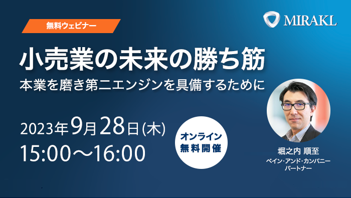 小売業が直面される未来のシナリオを踏まえて、本業を磨き上げ、成長に向けた新たな収益源を創造する動きが顕著になっています。本ウェビナーでは、グローバルで先行する小売業の動きを踏まえて、勝ち筋が何か、今から何を仕込んでいくべきなのかについて、ベイン・アンド・カンパニーのパートナー、堀之内 順至が登壇し最新知見を紹介しました。