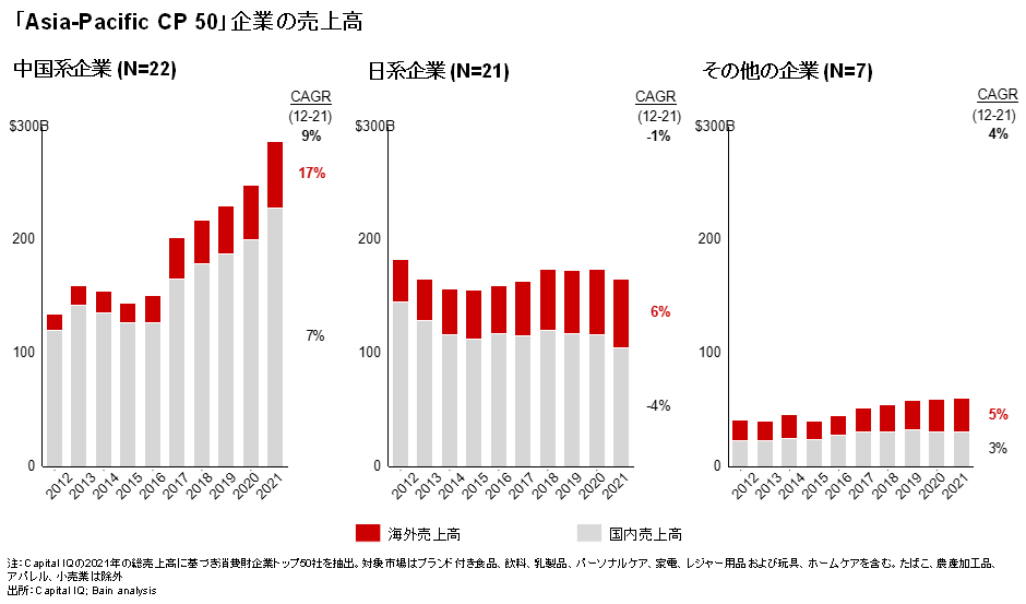 - 2012年から2021年までの間、アジア太平洋地域のトップ50消費財企業では、国外売上高が国内売上高の3倍の成長を示した