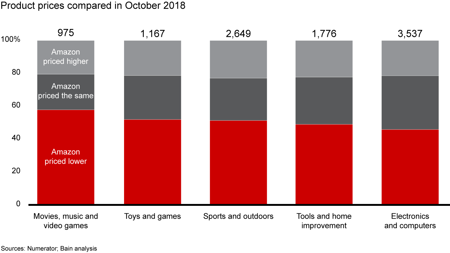 Customer experiences are critical, but price remains an important consideration for many consumers, especially during the holidays. According to research we conducted with ROI Consultancy Services, shoppers said “value for the money” was one of the most important purchase criteria in 9 out of 10 major product categories. When asked how well Amazon provided “value for the money,” consumers rated Amazon in the top 20% of retailers. Research we conducted with Numerator showed that Amazon matches or beats competitors’ prices on key products more than 75% of the time (see Figure 6).