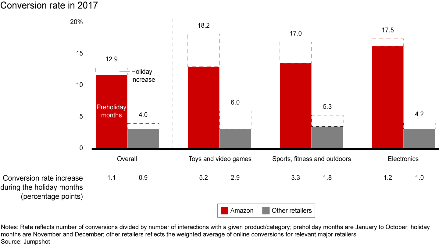 Amazon’s conversion rate—that is, the portion of its online product page views that result in a sale—ranged from 13% to 16% in key gift categories, such as toys and video games, from January through October last year, according to Jumpshot. That was triple the rate of nine other major retailers we analyzed, which converted 3% to 4%. Amazon’s rate jumped by as much as 5 percentage points during last year’s holiday season, while competitors reaped only moderate gains of 1 to 3 percentage points (see Figure 3).