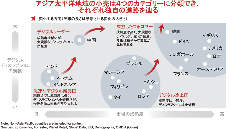 アジア太平洋地域の小売は極めて多様な市場から構成されている。予測困難なこれら市場のパターンを解き明かすため、ベインは従来の小売チャネルの規模、食料品市場の集中度およびその他の測定指標を用いて、市場成熟度を評価した。続いて、オンライン普及率や上位デジタル企業のEC市場占有率を基に、各国で生じているデジタルディスラプションの規模を特定し、成熟度に照らし合わせてマッピングした。このように市場をセグメント化した結果、アジア太平洋地域は4つのグループに分類でき、それぞれ独自の進路を辿ることが見えてきた。