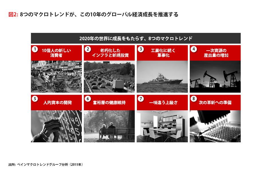 経済的混乱は継続すると思われるが、世界経済は長期にわたって年平均3.6%で成長し、世界のGDPは2020年までに現在の水準よりも4割増となる90兆ドルにまで増大する見込みである。特に成長の源泉は、新興国経済にますます傾斜していくだろう。先進国は現在世界のGDPの3分の2を生み出しているが、途上国及び新興国は将来的にGDP成長のシェアの大部分を占めるだろう。結果として2020年までに、世界のGDPにおける先進国の割合が58%まで下がるという短期間で大きな変化が生じると予想される。