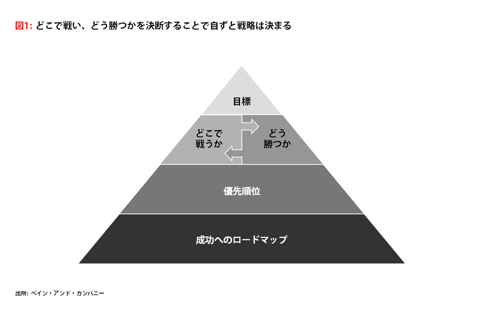 戦略とは、目標をいかに実現するかを明確に示すものである(図1)。会社はどの市場で戦いを挑むかを決断しなくてはならない。また、競争に打ち勝つためには、競合相手と差別化された能力を育む必要もある。大抵の場合、勝利の戦略とは市場でリーダーシップを確立し経済性を生むことである。市場をリードする企業のコストは、競合他社に比べて低いことが多い。さらに、価格支配力、ブランド認知度、差別化のすべてにおいて優れている。こうした優位性が好調な業績をもたらすのだ。例えば、資本利益率でみると、業界をリードする企業は追随する企業の2倍の業績を達成している。