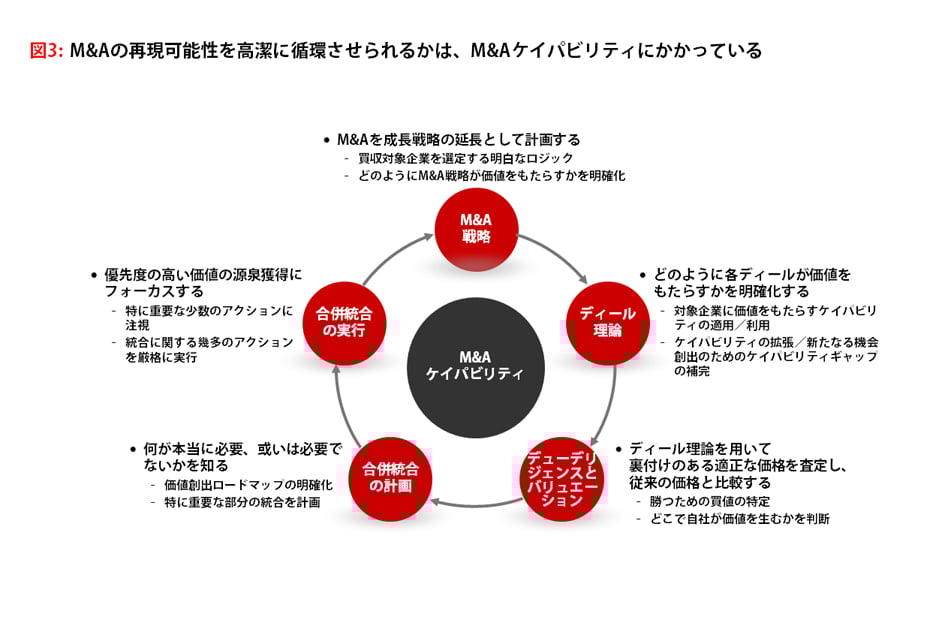 その能力をイメージする方法として、買収プロセスをディール毎に繰り返される一連の周期として、つまりM&A再現性の好循環として考えてみよう(図3)。