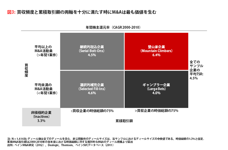 M&Aの頻度と絶対的取引量の双方を組み合わせると、どのような企業がM&Aにおいて最も成功しているか明確であろう(図3)。また、M&Aをその視点で見ると、どのような取引が最大の報酬をもたらすかも明らかになる。