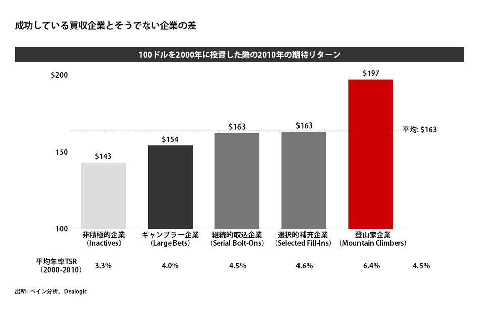 唯一、ディールによるリターンが平均を顕著に上回ったのが、「登山家企業(Mountain Climbers)」である。これらの企業はM&Aにおけるスター企業であり、平均値より約2%ポイント、非積極的企業より3%ポイント以上も上回るリターンを誇っている。これらの企業は、頻度、絶対的取引量の両観点から見て積極的に買収を行っている。彼らのディールは、一般的に、よく思慮されており、彼らが有する戦略を強化するような場合が多い。ディールを進める力や統合する力といった強力なケイパビリティを構築しており、それらを大きな買収案件や複雑な取引時に効果的に利用している。
