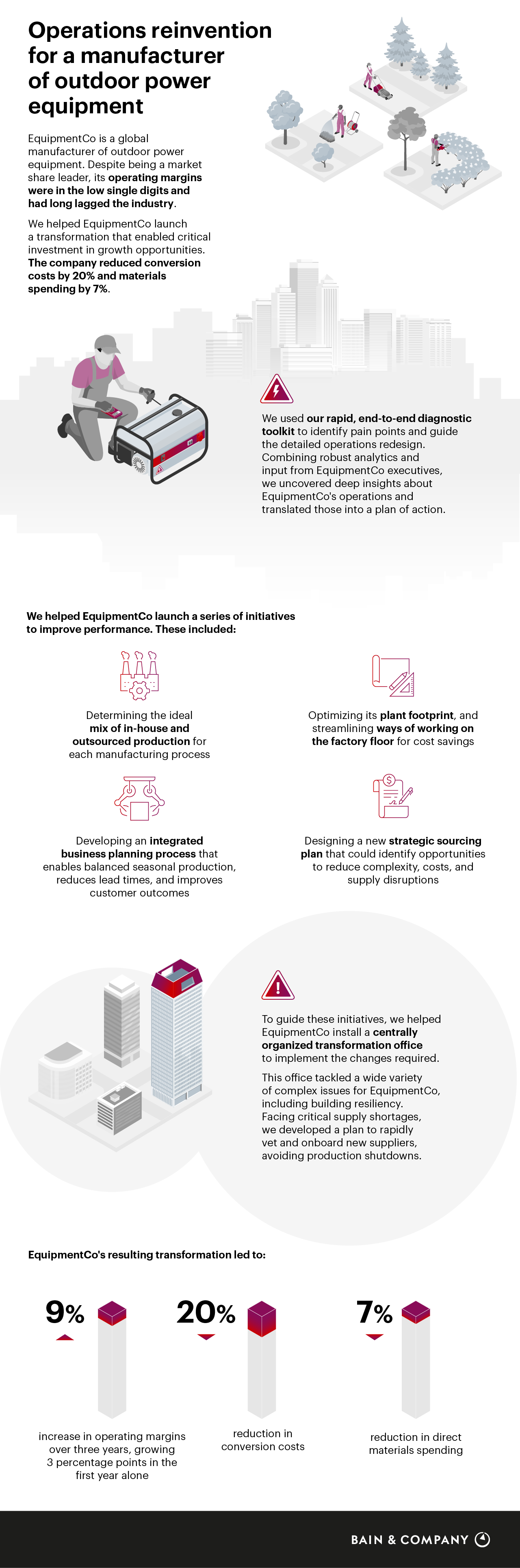 An Operations Redesign Helps a Manufacturer Boost Margins The company reduced conversion costs by 20% and materials spending by 7%. An Operations Redesign Helps a Manufacturer Boost Margins Tags Automation COO insights Lean Six Sigma Manufacturing オペレーション フルポテンシャル・トランスフォメーション 購買・調達 産業機械 産業財、サービス