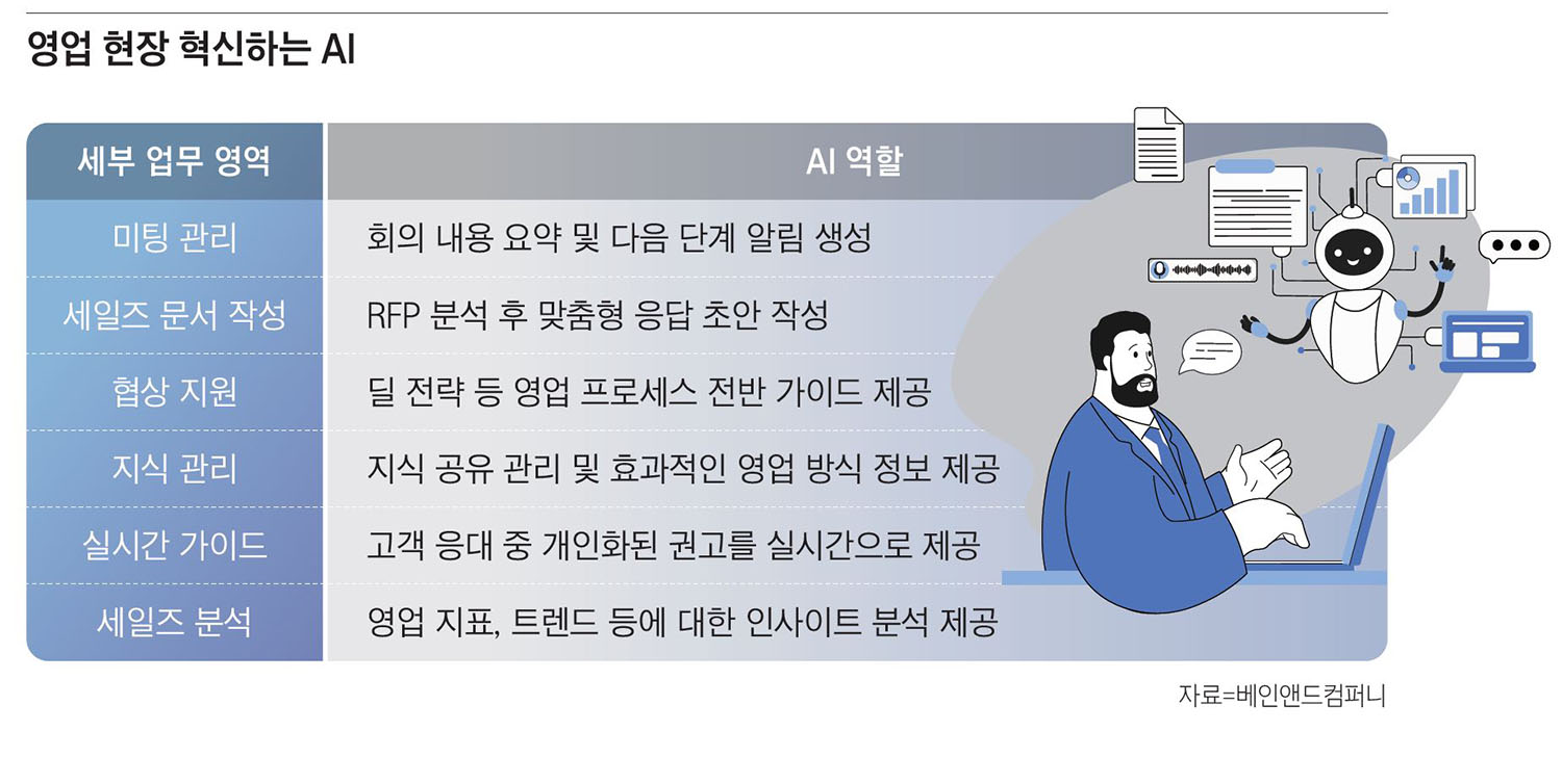 [이코노미조선=신문섭 베인앤드컴퍼니 대표파트너] 과거 ‘영업은 발로 뛴다’는 말이 상식이었다. 하지만 이제는 사람의 발만으로는 경쟁이 버거운 시대다. 생성 AI(Generative AI)가 사무직 전반의 생산성을 끌어올리는 가운데, 영업 현장도 조용히 그러나 빠르게 바뀌고 있다.
