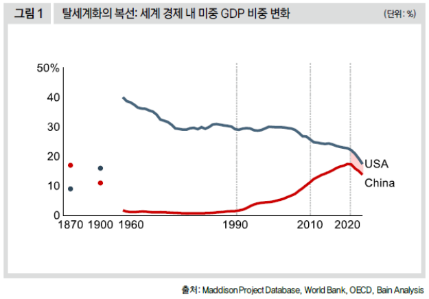이미 발사된 총이 있다. 글로벌 대전환의 첫 번째 축, 탈세계화다. 미중 패권 경쟁에서 비롯한 양국 간 무역 갈등이 트럼프 2기 행정부 들어 전 세계적 상호 관세 부과 및 WTO 규범 약화, 이로 인한 리쇼어링과 경제 블록 재편으로 이어지고 있다. 단순한 무역 분쟁을 넘어선 새로운 세계 질서 재편의 단초다. 탈세계화가 본격화하기까지 세계 경제 무대에 수십 년간 깔려 있던 복선은 바로 중국의 부상이다.1978년 개혁·개방 이후 중국은 40년 넘게 연평균 9~10% 수준의 고성장을 이어왔고 2010년에는 일본을 제치며 세계 2위 경제 대국으로 올라섰다. 개혁 이전까지 약 2%대에 머물던 글로벌 GDP 내 비중은 현재 17% 안팎까지 확대됐다. 이는 단순히 한 국가의 경제 성장 스토리가 아니라 역사의 무대에 놓인 거대한 복선이었다. 중국의 부상은 글로벌 기업들에 저임금 노동력과 거대 시장을 제공하며 세계화의 엔진이 됐지만 동시에 미국의 제조 경쟁력 쇠퇴와 유관 생태계 전반의 약화를 초래하면서 미국 패권에 대한 구조적 도전으로 이어졌다.
