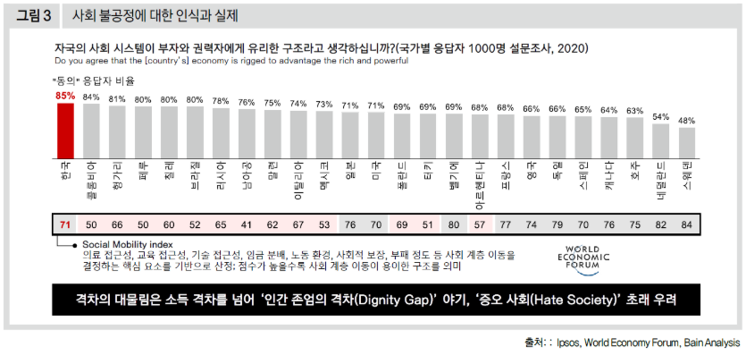 세계화와 기술 발전은 ‘경제 성장’이라는 과실을 키웠지만 그 과실이 공평하게 분배되지 못했다. 세대를 거듭할수록 자산·소득 격차가 확대되고 신규 세대 간 갈등 또한 증폭됐다. 경제 성장이 둔화하기 시작하면 사회적 격차는 곧 기회의 불공정과 경험의 격차를 더 크게 만든다. 자산과 소득에 기초해 나타나는 사회 계층의 대물림은 ‘인간 존엄의 격차’로 받아들여질 수 있다. 사회 전반적으로 분노와 증오, 우울의 수준은 높아진다. 경제 생산 활력 저하의 차원을 넘어 구성원의 안전을 위협할 수도 있는 위험 요인이다.
